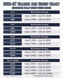 Age groups change for the fall 2026 season. Find your age group below. Players are encouraged to attend the session for the age group they will compete in during the 2026/2027 soccer season.